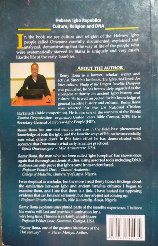 Nze Remy Ilona’s book, Igbo Hebrew Republic, extensively discusses the religion and culture of the Igbo people of Nigeria, known as OmeNa-Ana, and draws comparisons with the religion and culture of ancient Israel, as found in what is generally regarded as the Old Testament. In his attempt to demonstrate the similarities between the religion and culture of the Hebrew Igbos and ancient Israel, Nze Remy Ilona passionately showcased through academic research some omenana traditions that ancient Israel followed. This book, which is research-based, is, in my opinion, certainly the only one that has gone so deep in highlighting, comparing, and asserting what I refer to as “veritable evidence of connection” between Igbo culture and religion and ancient Israel’s religion and culture.